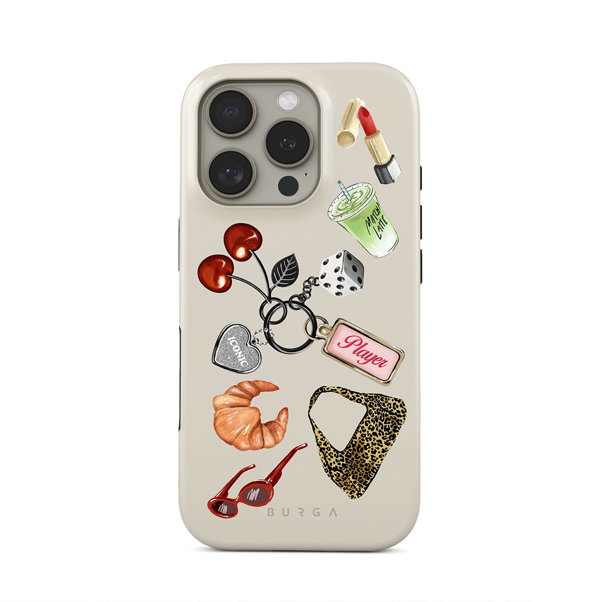 This design features: red sunglasses, red lipstick, green matcha drink, croissant, black dice, leopard-print bag, keychain with silver heart, cherries, dice and "Player" tag