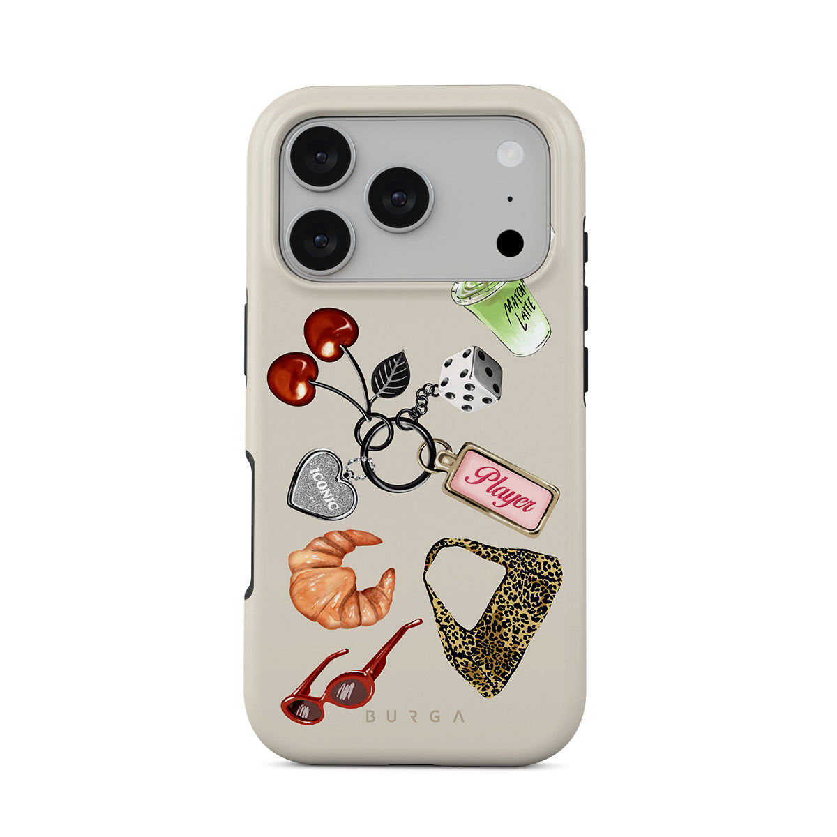 This design features: red sunglasses, red lipstick, green matcha drink, croissant, black dice, leopard-print bag, keychain with silver heart, cherries, dice and "Player" tag