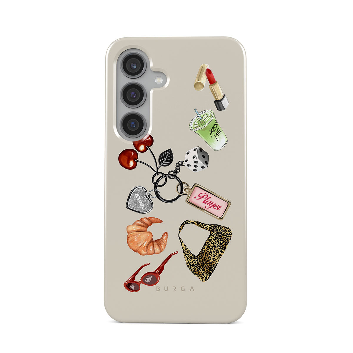 This design features: red sunglasses, red lipstick, green matcha drink, croissant, black dice, leopard-print bag, keychain with silver heart, cherries, dice and "Player" tag