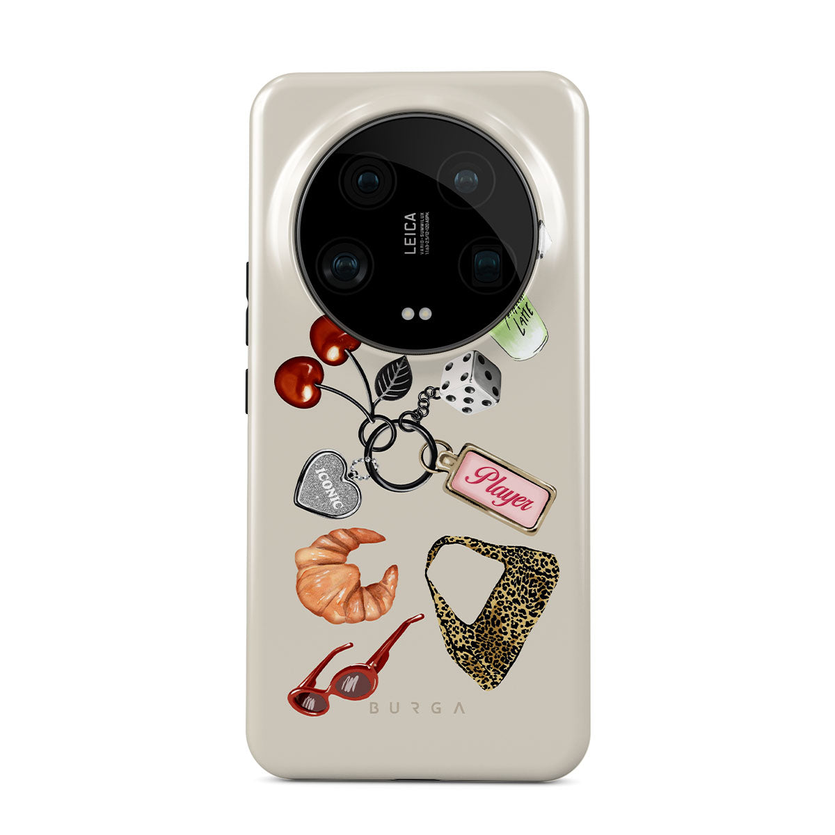 This design features: red sunglasses, red lipstick, green matcha drink, croissant, black dice, leopard-print bag, keychain with silver heart, cherries, dice and "Player" tag