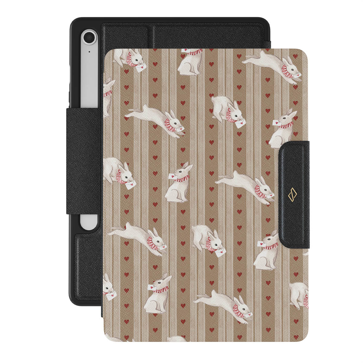 This design features: white rabbits, hearts, love, letters, vintage stripes