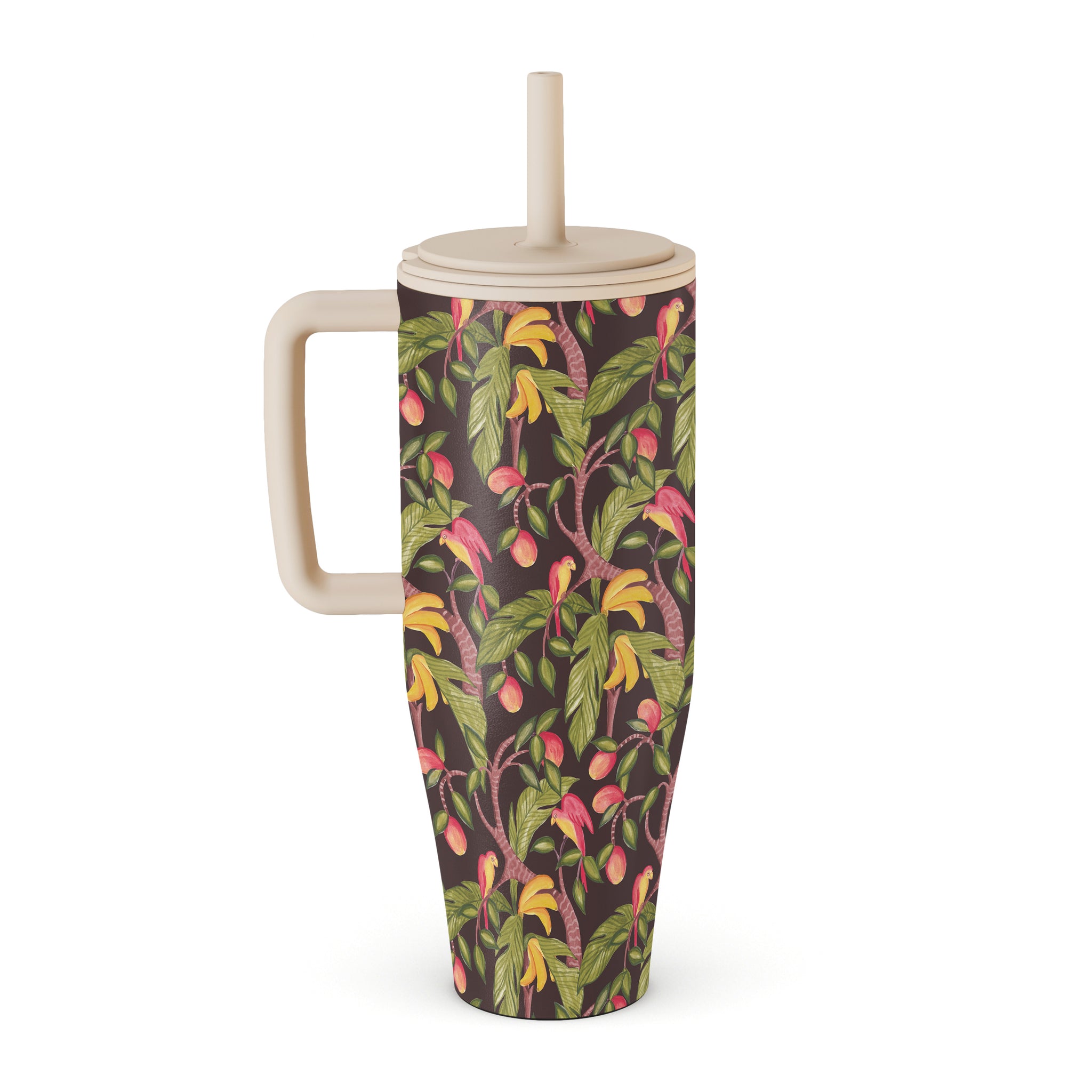 This design features: mangoes, dark green leaves, jungle-inspired pattern