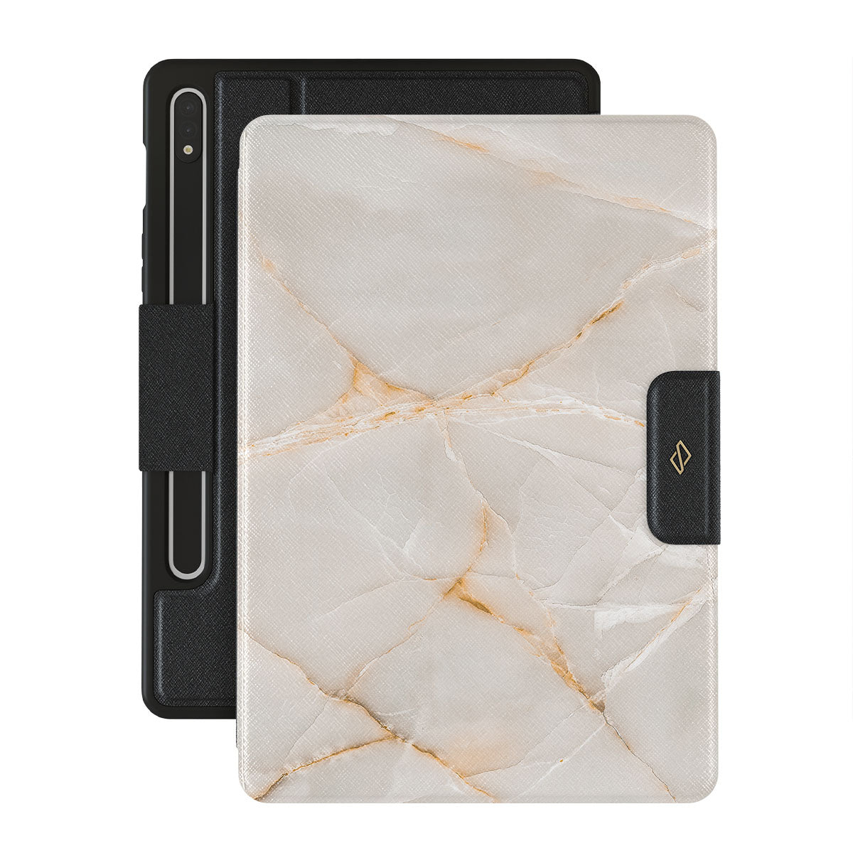 The Vanilla Sand Marble Samsung Galaxy Tab S8+/S7+/S7 FE folio case cover features a marble design with creamy canvas showcasing beautiful golden hues. The soft-toned case will add a touch of luxury to the device while protecting it from dangerous falls.