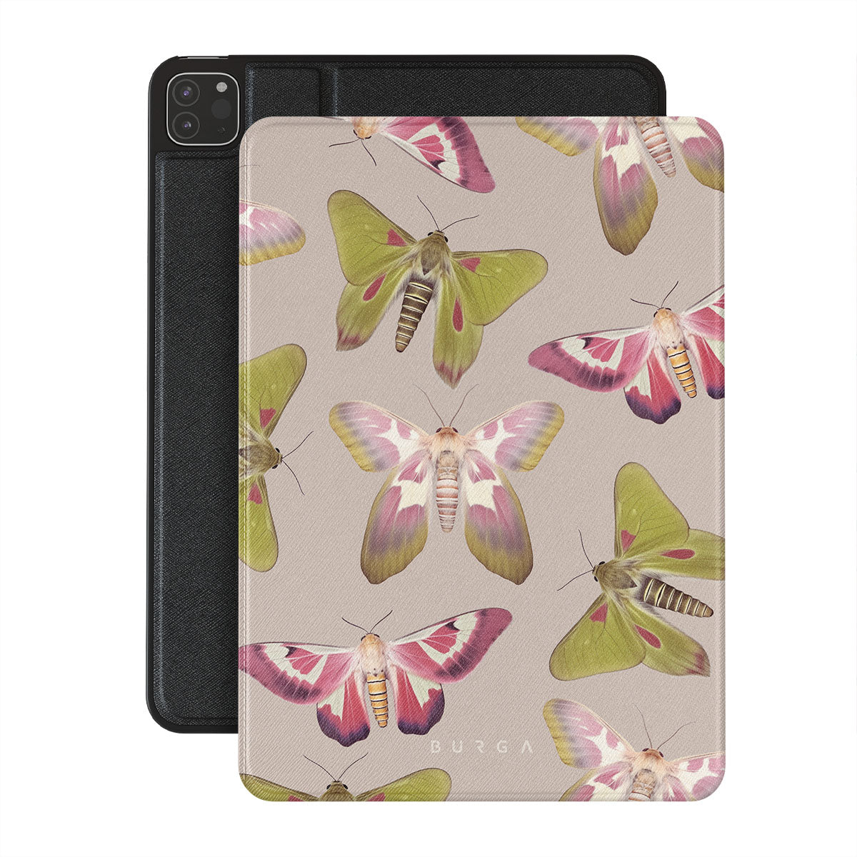 A tapestry of muted-toned moths — their wing patterns echoing tales of transformation and resilience found in nature's delicate beings. These moths, wings wide, serve as silent mentors, teaching us that every phase of life and change holds its own magic and mystery. Discover our Metamorphosis iPad Pro 12.9 (4th/3rd Gen) folio casedesign.