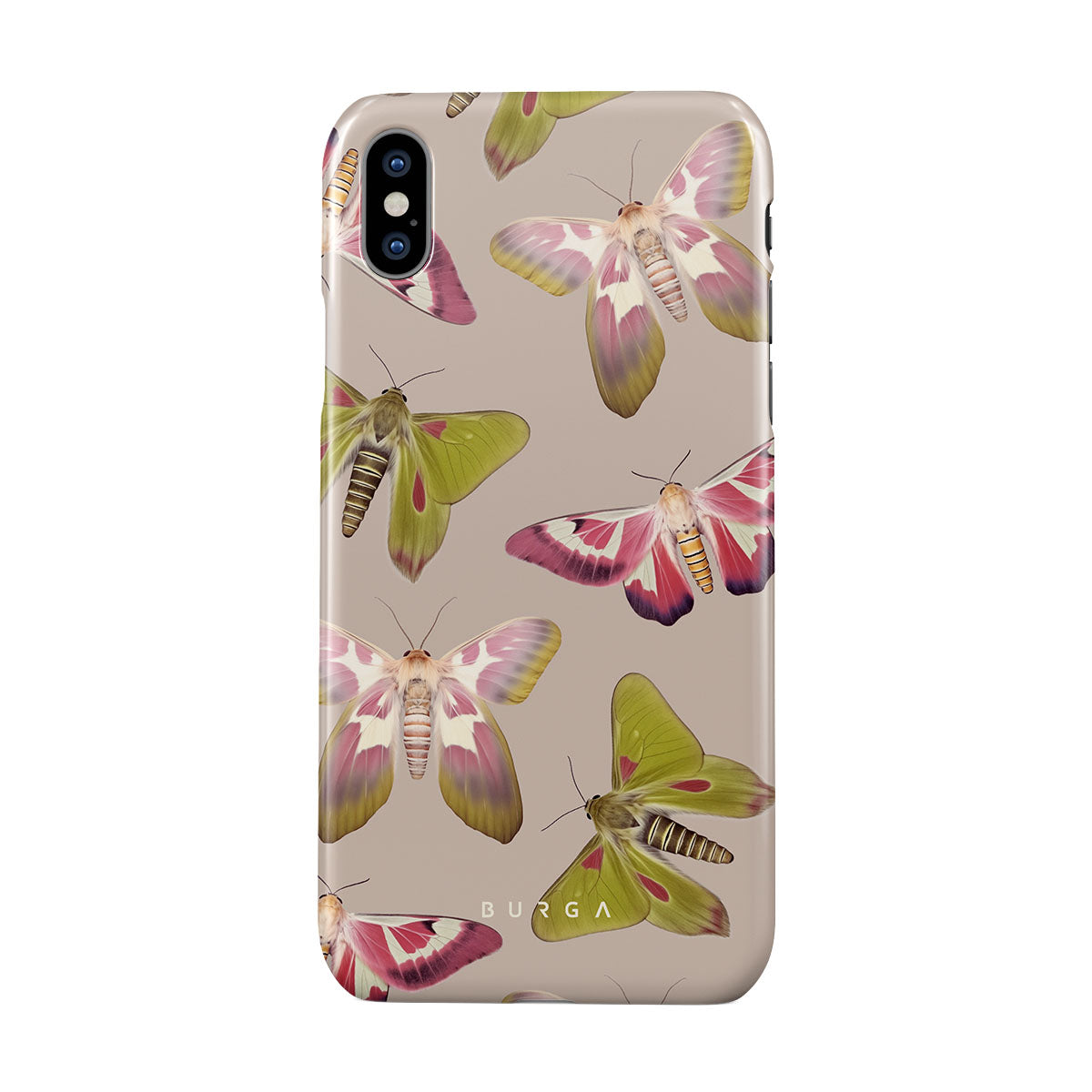 A tapestry of muted-toned moths — their wing patterns echoing tales of transformation and resilience found in nature's delicate beings. These moths, wings wide, serve as silent mentors, teaching us that every phase of life and change holds its own magic and mystery. Discover our Metamorphosis iPhone XS Max phone casedesign.