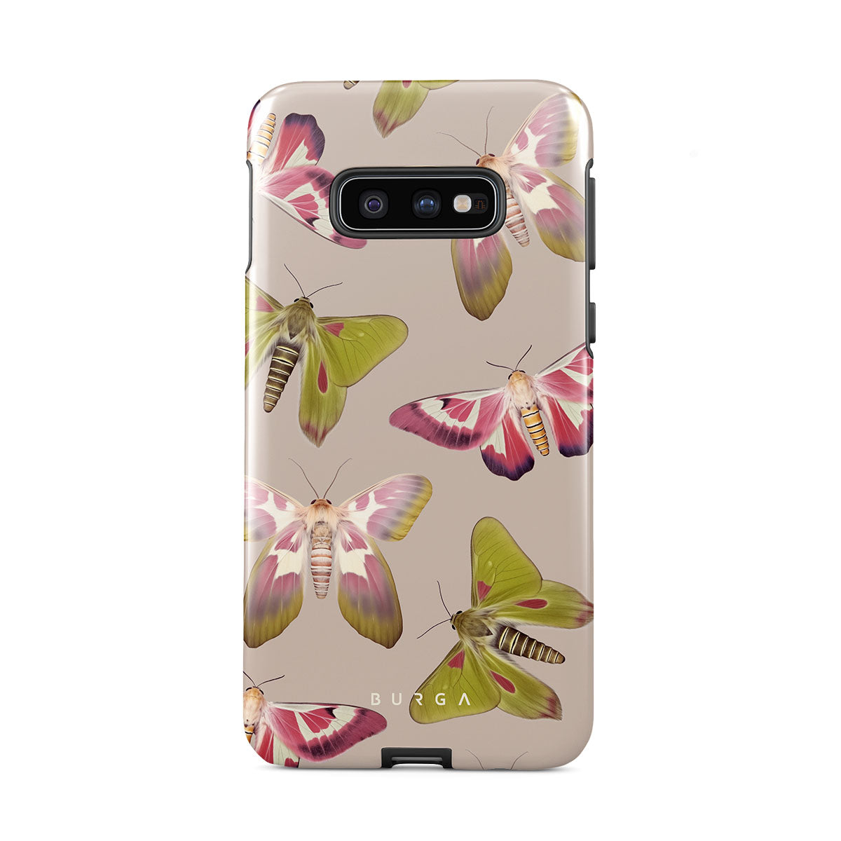 A tapestry of muted-toned moths — their wing patterns echoing tales of transformation and resilience found in nature's delicate beings. These moths, wings wide, serve as silent mentors, teaching us that every phase of life and change holds its own magic and mystery. Discover our Metamorphosis Samsung Galaxy S10E phone casedesign.