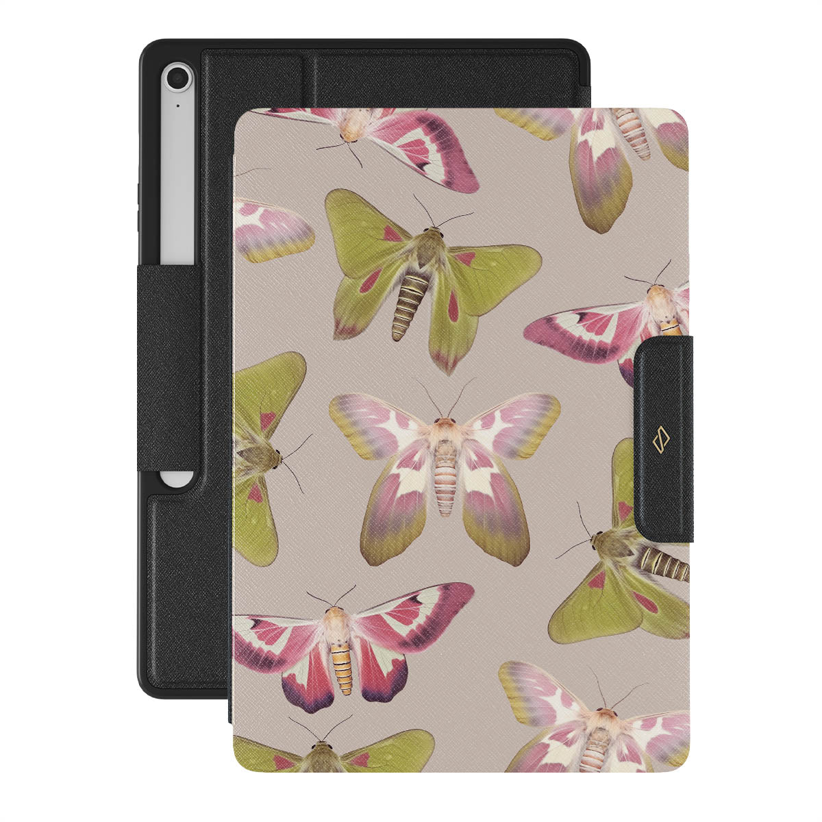 A tapestry of muted-toned moths — their wing patterns echoing tales of transformation and resilience found in nature's delicate beings. These moths, wings wide, serve as silent mentors, teaching us that every phase of life and change holds its own magic and mystery. Discover our Metamorphosis Samsung Galaxy Tab S10+ FE folio casedesign.