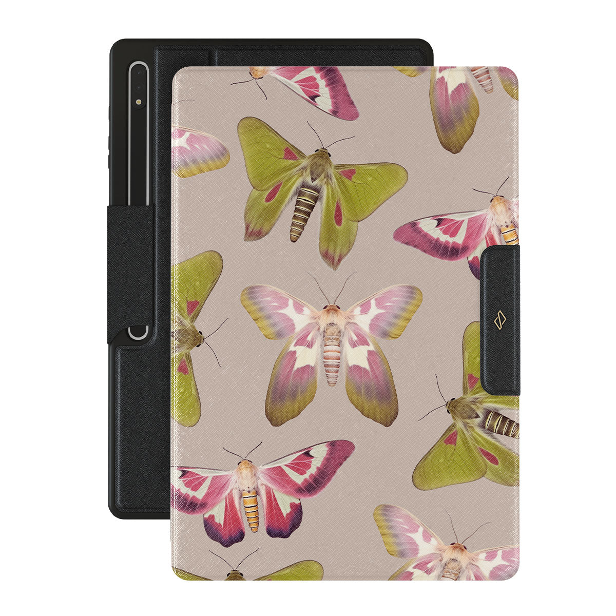 A tapestry of muted-toned moths — their wing patterns echoing tales of transformation and resilience found in nature's delicate beings. These moths, wings wide, serve as silent mentors, teaching us that every phase of life and change holds its own magic and mystery. Discover our Metamorphosis Samsung Galaxy Tab S9 Ultra folio casedesign.