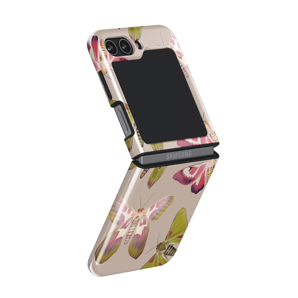 A tapestry of muted-toned moths — their wing patterns echoing tales of transformation and resilience found in nature's delicate beings. These moths, wings wide, serve as silent mentors, teaching us that every phase of life and change holds its own magic and mystery. Discover our Metamorphosis Samsung Galaxy Z Flip 5 phone casedesign.