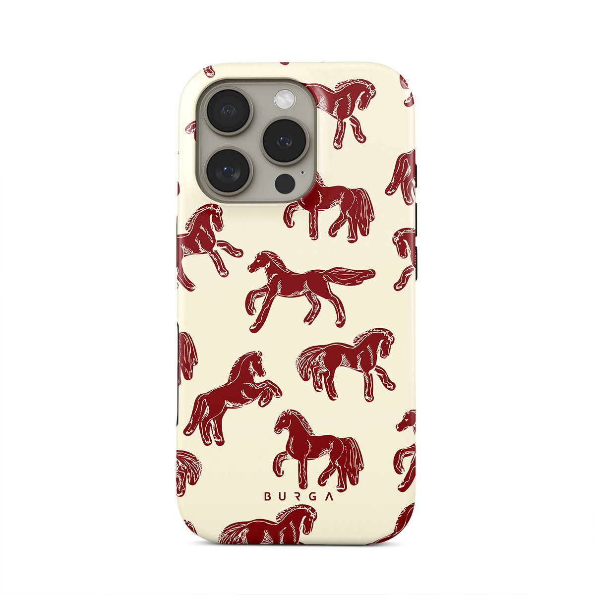 It's time to unleash your wild side with the Mustang design. Bold red horses gallop across a nude background, capturing the spirit of untamed adventure. This iPhone 16 Pro Max phone case is perfect for the free-spirited souls ready to ride into the unknown.