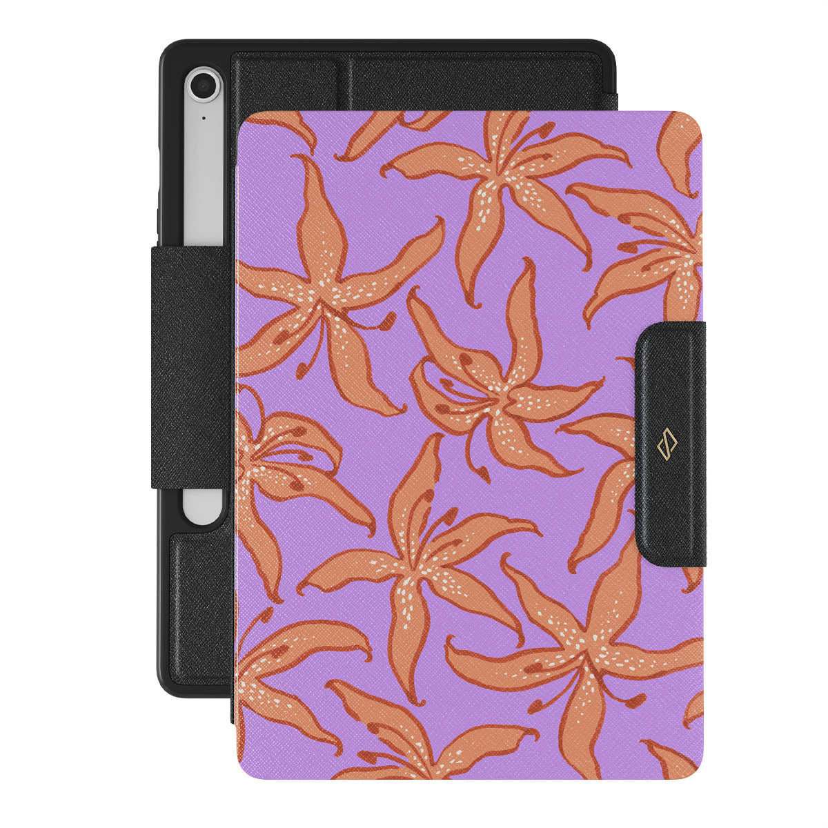 This design features: orange lilies, purple background
