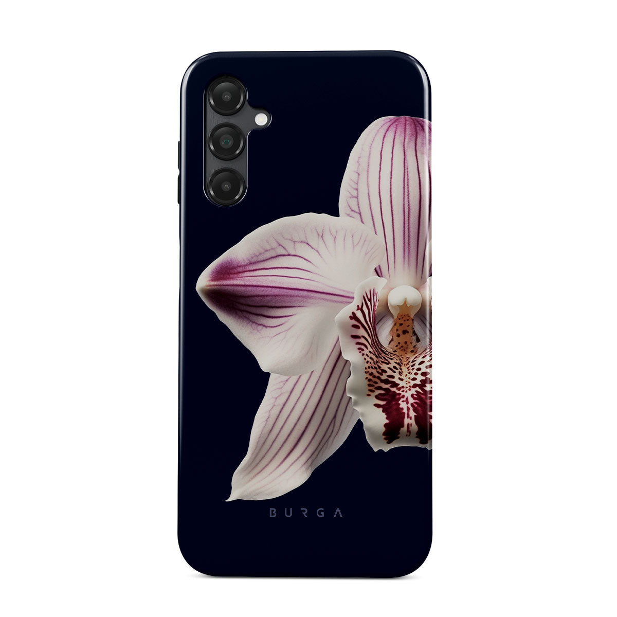 The white orchid blooms boldly upon a night sky blue, a beacon of clarity in the darkness. Our Nectar Samsung Galaxy A25 phone case design speaks to the soul's desire to find light within, to illuminate the hidden paths of self-discovery that only reveal themselves under the cloak of introspection.