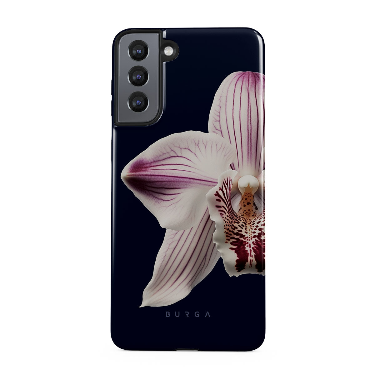 The white orchid blooms boldly upon a night sky blue, a beacon of clarity in the darkness. Our Nectar Samsung Galaxy S21 phone case design speaks to the soul's desire to find light within, to illuminate the hidden paths of self-discovery that only reveal themselves under the cloak of introspection.