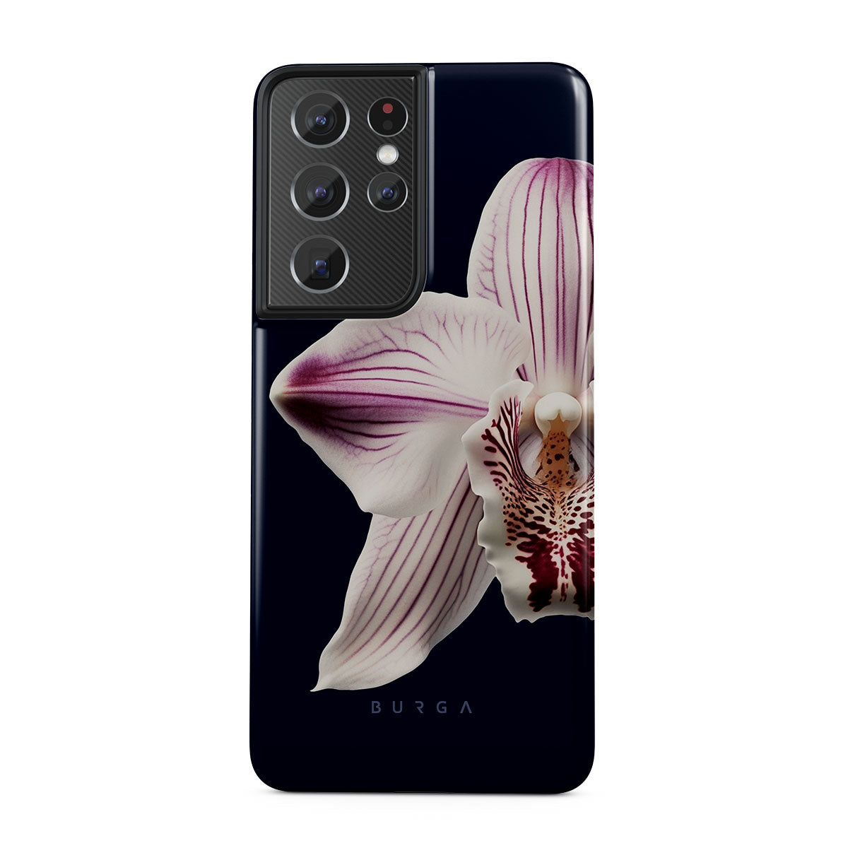 The white orchid blooms boldly upon a night sky blue, a beacon of clarity in the darkness. Our Nectar Samsung Galaxy S21 Ultra phone case design speaks to the soul's desire to find light within, to illuminate the hidden paths of self-discovery that only reveal themselves under the cloak of introspection.