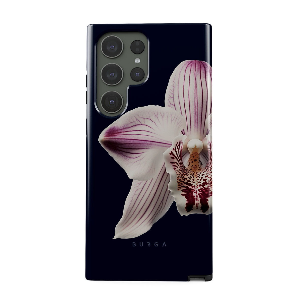 The white orchid blooms boldly upon a night sky blue, a beacon of clarity in the darkness. Our Nectar Samsung Galaxy S23 Ultra phone case design speaks to the soul's desire to find light within, to illuminate the hidden paths of self-discovery that only reveal themselves under the cloak of introspection.