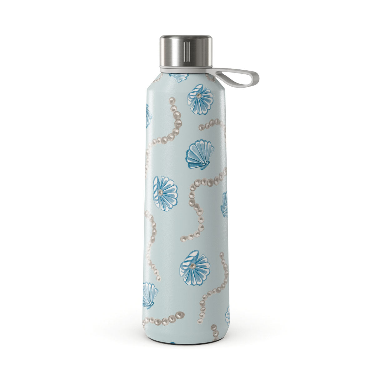 This design features: pearls, seashells, light blue background, marine elements