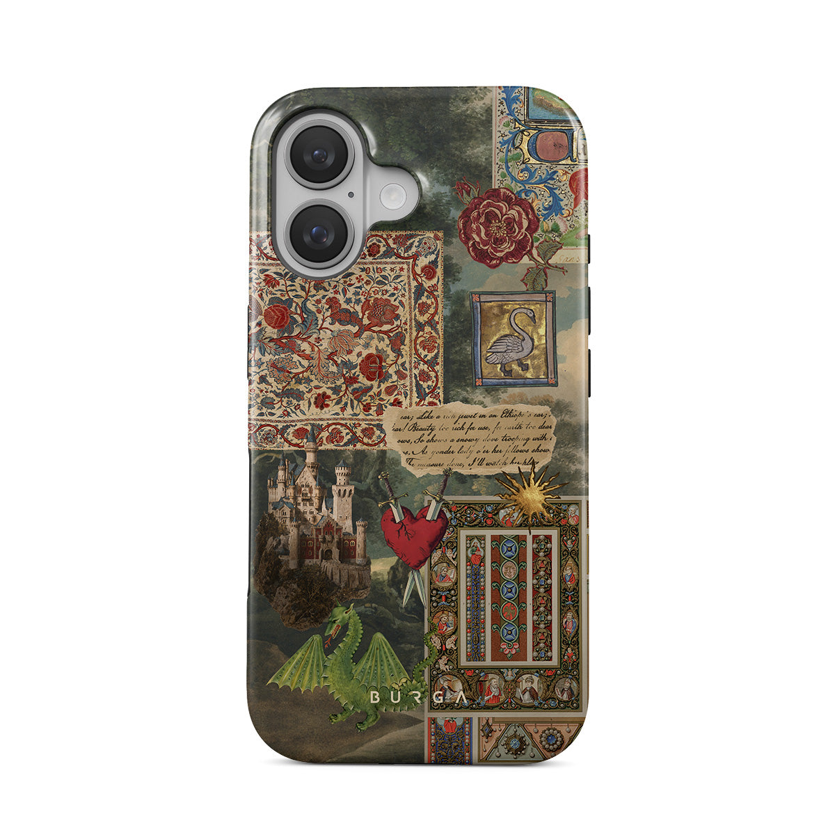 This design features: handwritten calligraphy font, vintage print, medieval design, floral pattern, old book illustrations, heart, dragon, castle