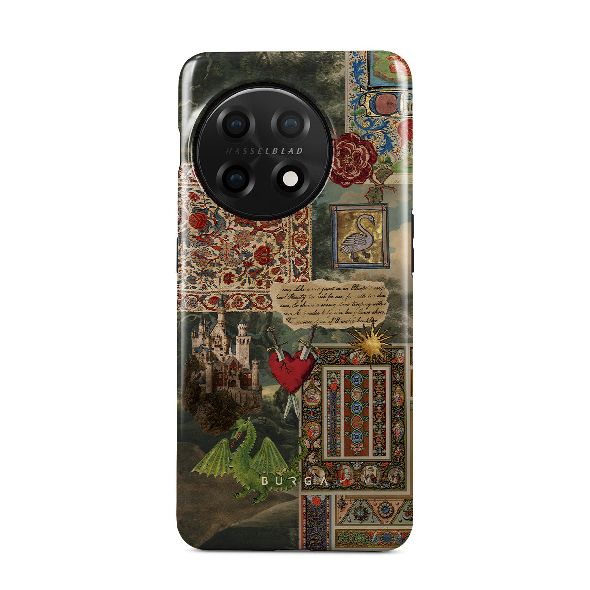 This design features: handwritten calligraphy font, vintage print, medieval design, floral pattern, old book illustrations, heart, dragon, castle