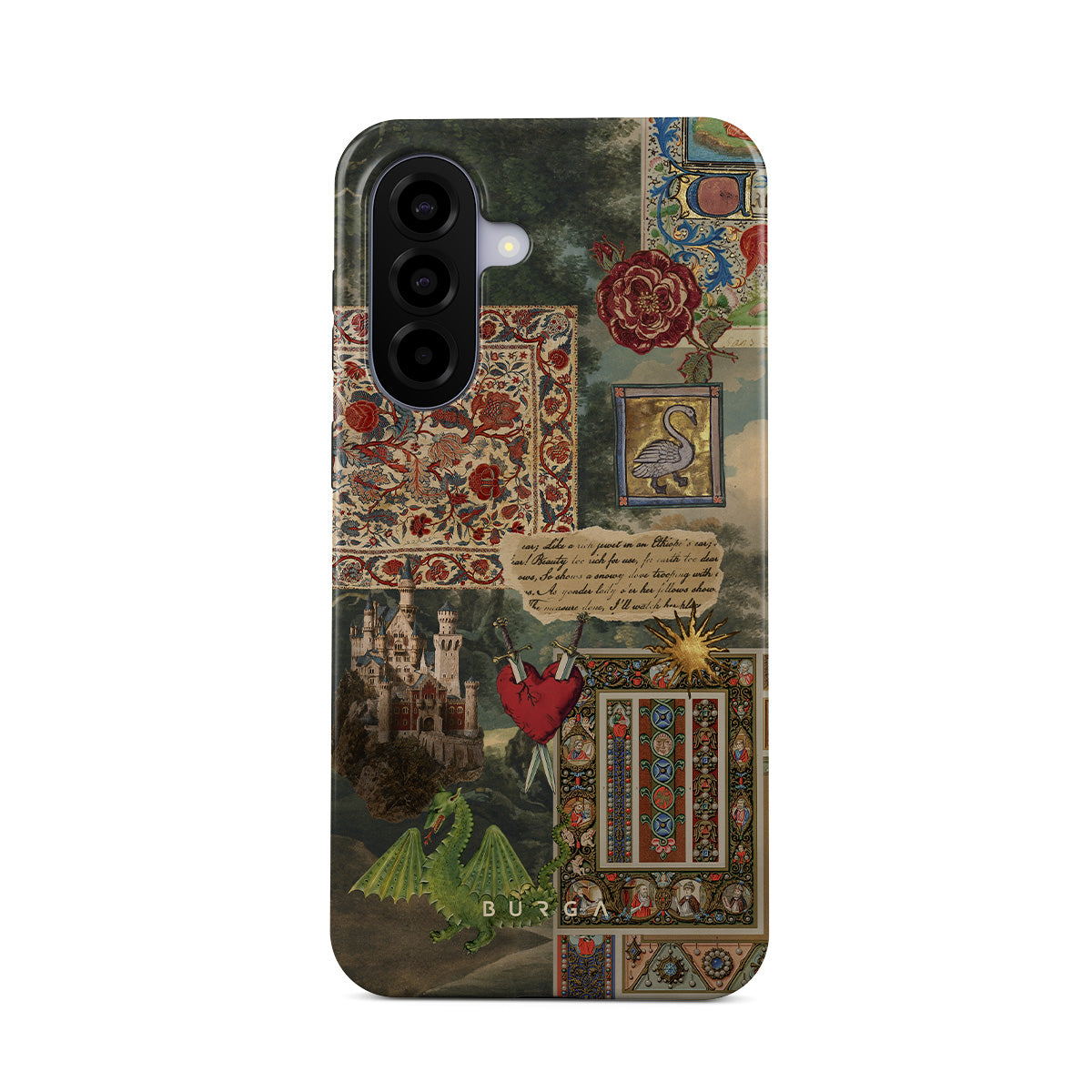 This design features: handwritten calligraphy font, vintage print, medieval design, floral pattern, old book illustrations, heart, dragon, castle