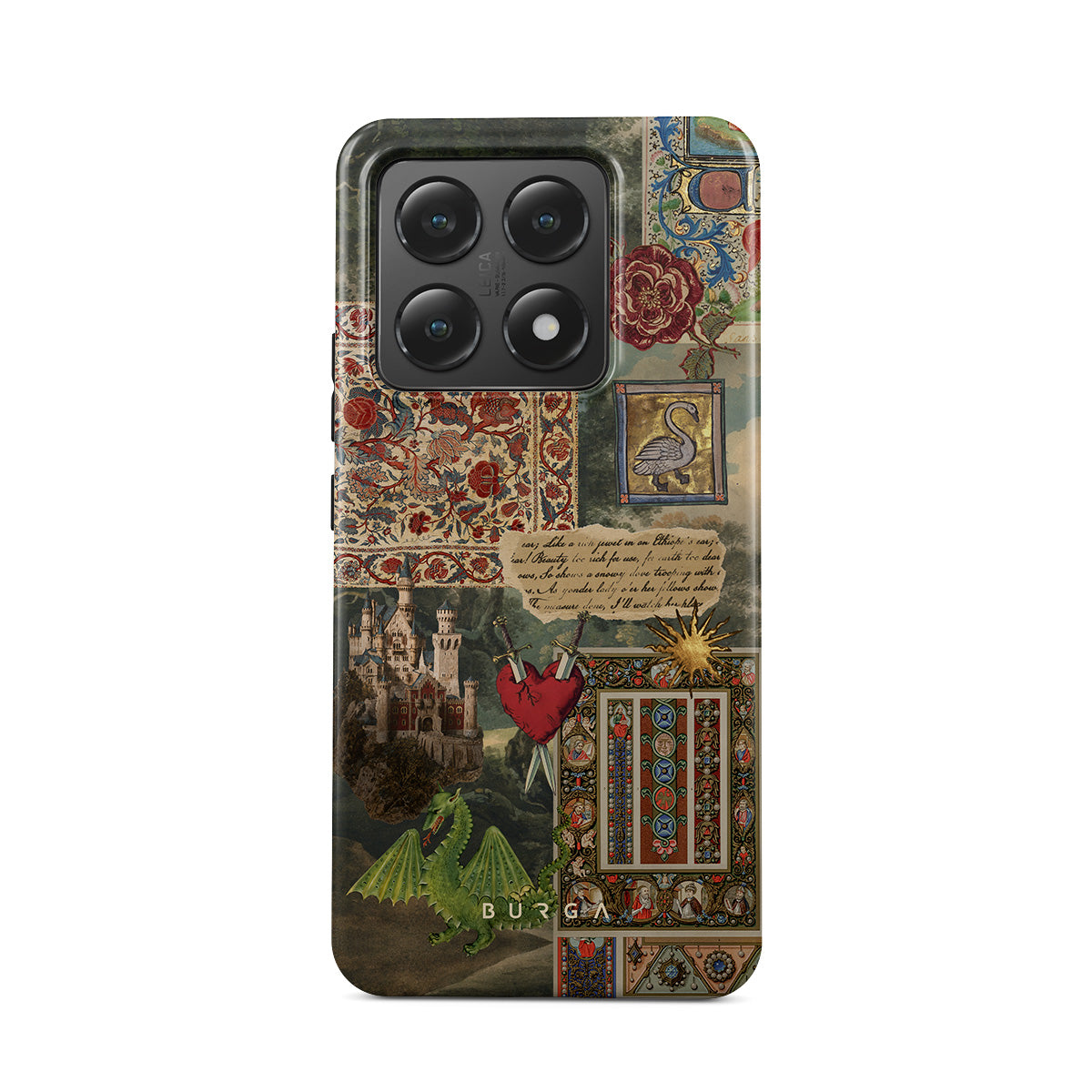 This design features: handwritten calligraphy font, vintage print, medieval design, floral pattern, old book illustrations, heart, dragon, castle