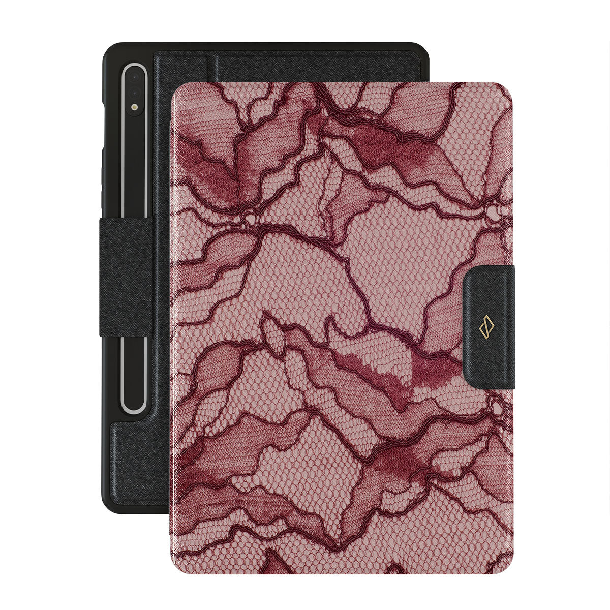 Channel your inner power with our Office Siren Samsung Galaxy Tab S9 FE folio case design. A soft rosé backdrop and dark pink lace blend elegance and boldness, perfect for those who make quiet yet undeniable statements with confidence.