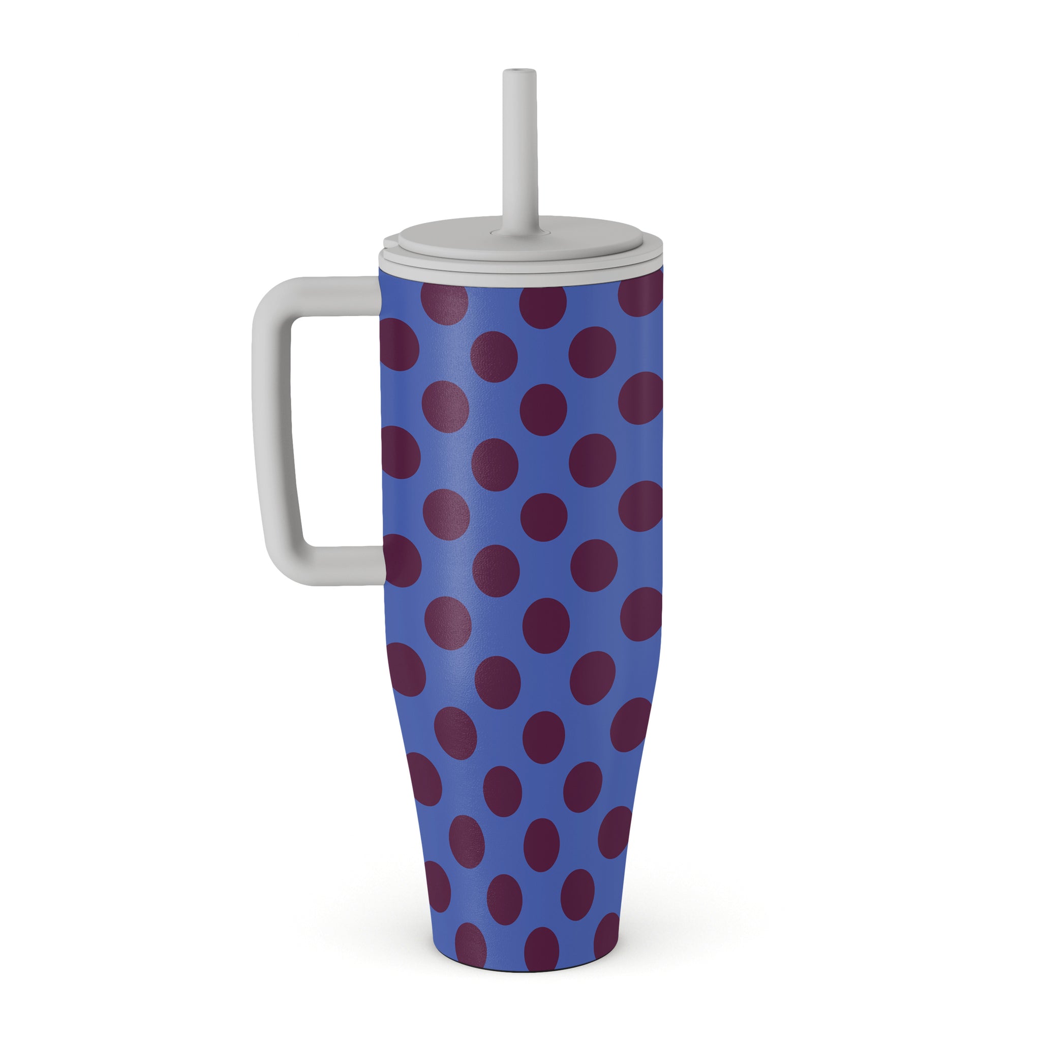 This design features: blue background, brown dots, polka dot pattern