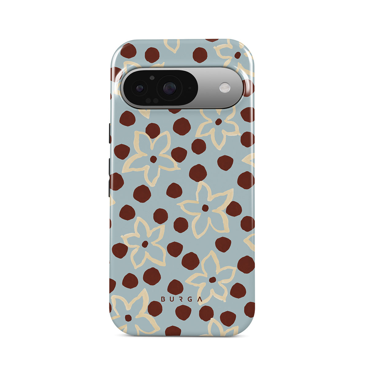 The Frutaria Google Pixel 9 phone case design design: retro surf motel wallpaper meets vintage ceramics. The soft florals, earthy dots, and cool-toned palette give major “forgotten seaside town in the ‘70s” energy.