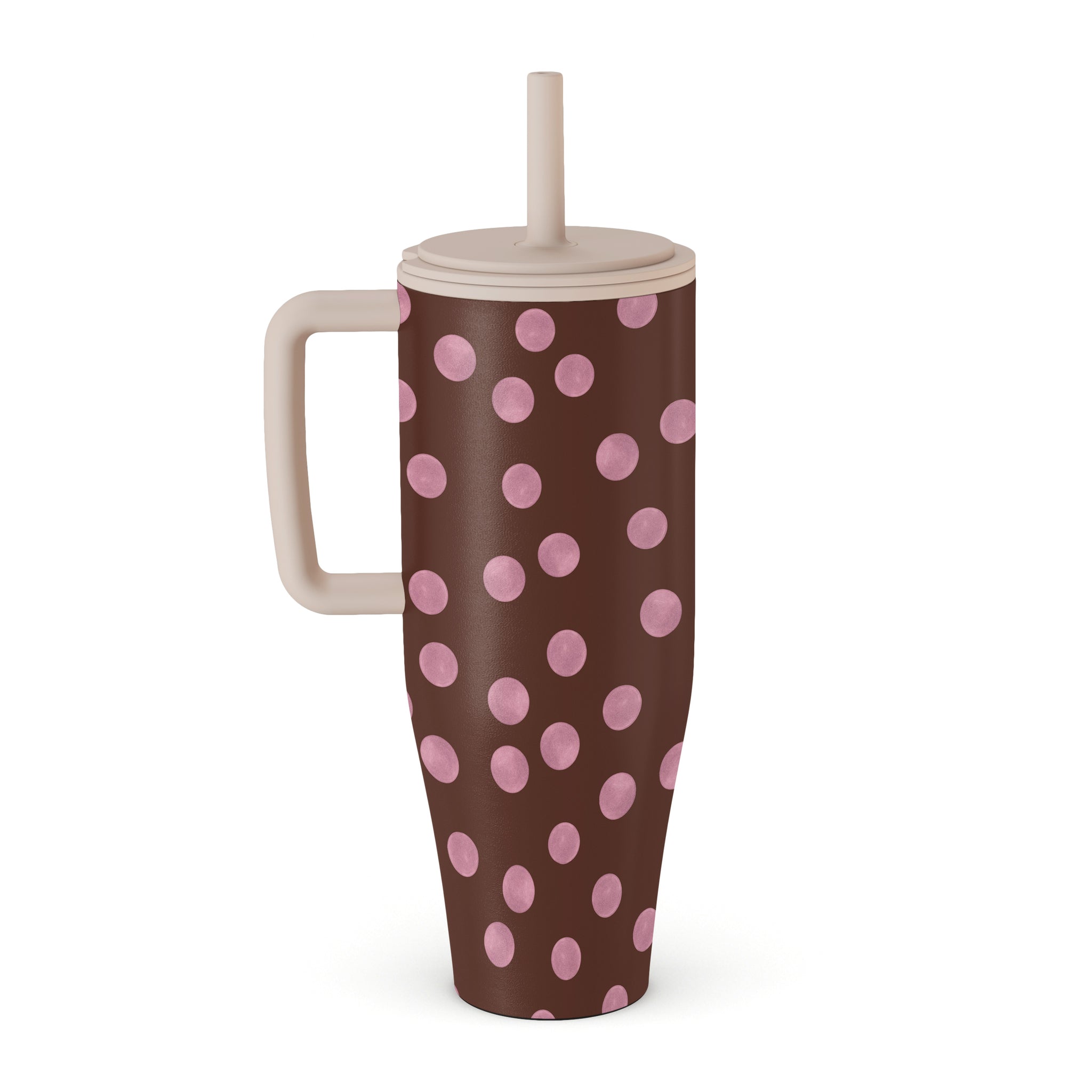 This design features: pink polka dots, brown background, dotted pattern