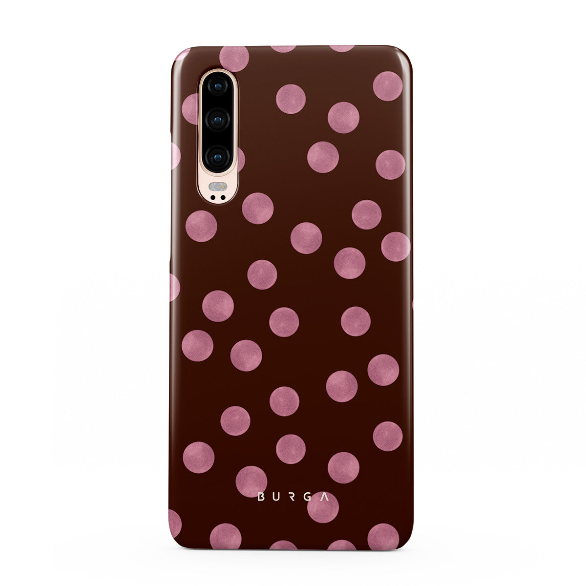 This design features: pink polka dots, brown background, dotted pattern