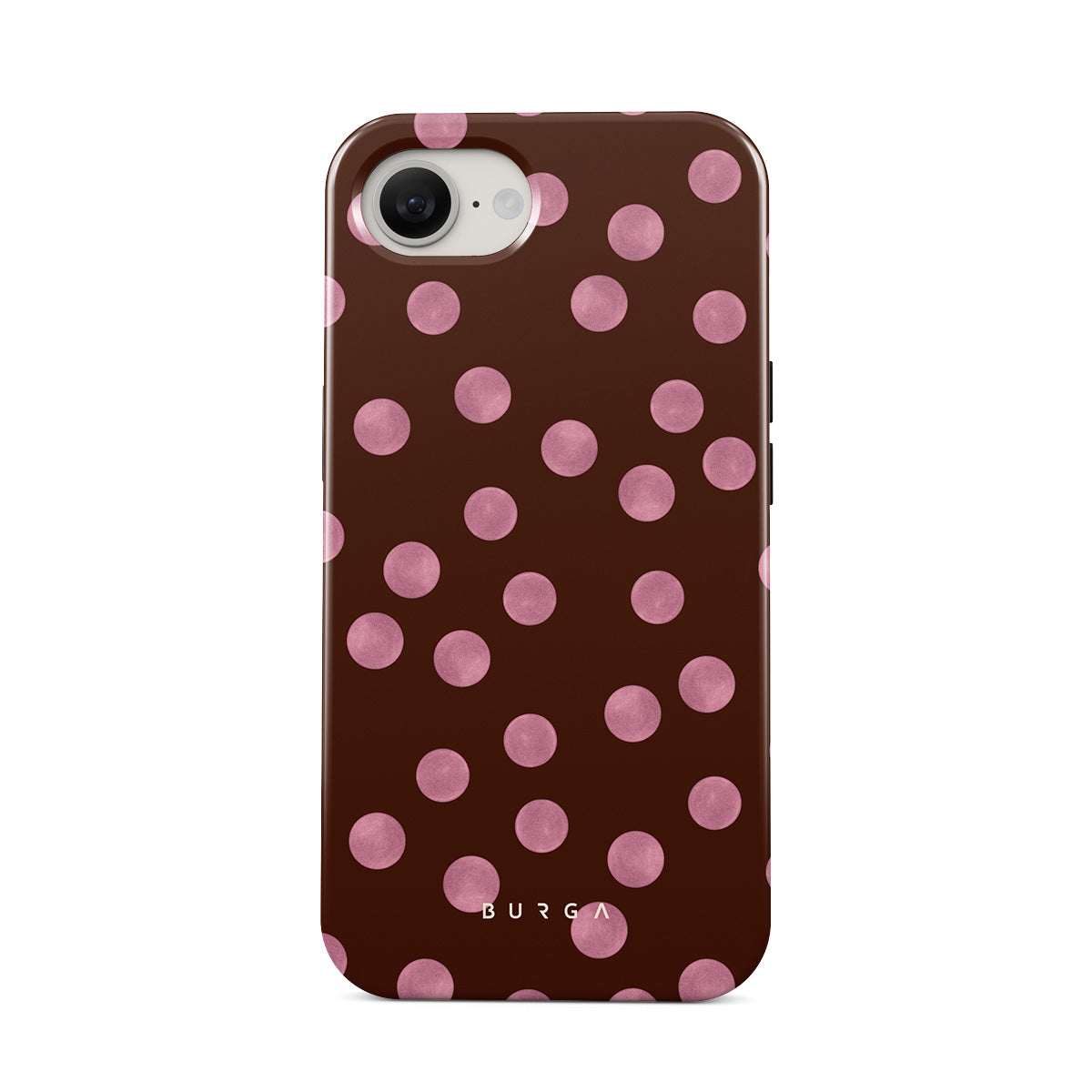 This design features: pink polka dots, brown background, dotted pattern