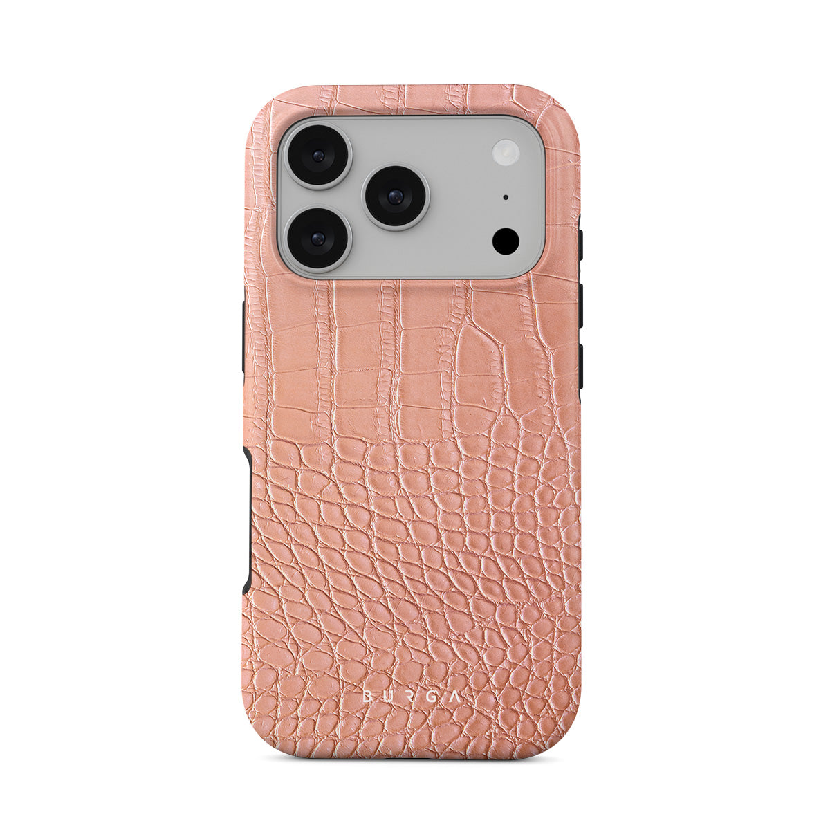Our Pink Croco iPhone 17 Pro phone case features a classic crocodile design reimagined and showcased in a soft coral shade. The new take on the dangerous animal print will add a touch of softness to your style while simultaneously offering heavy-duty protection to your device.