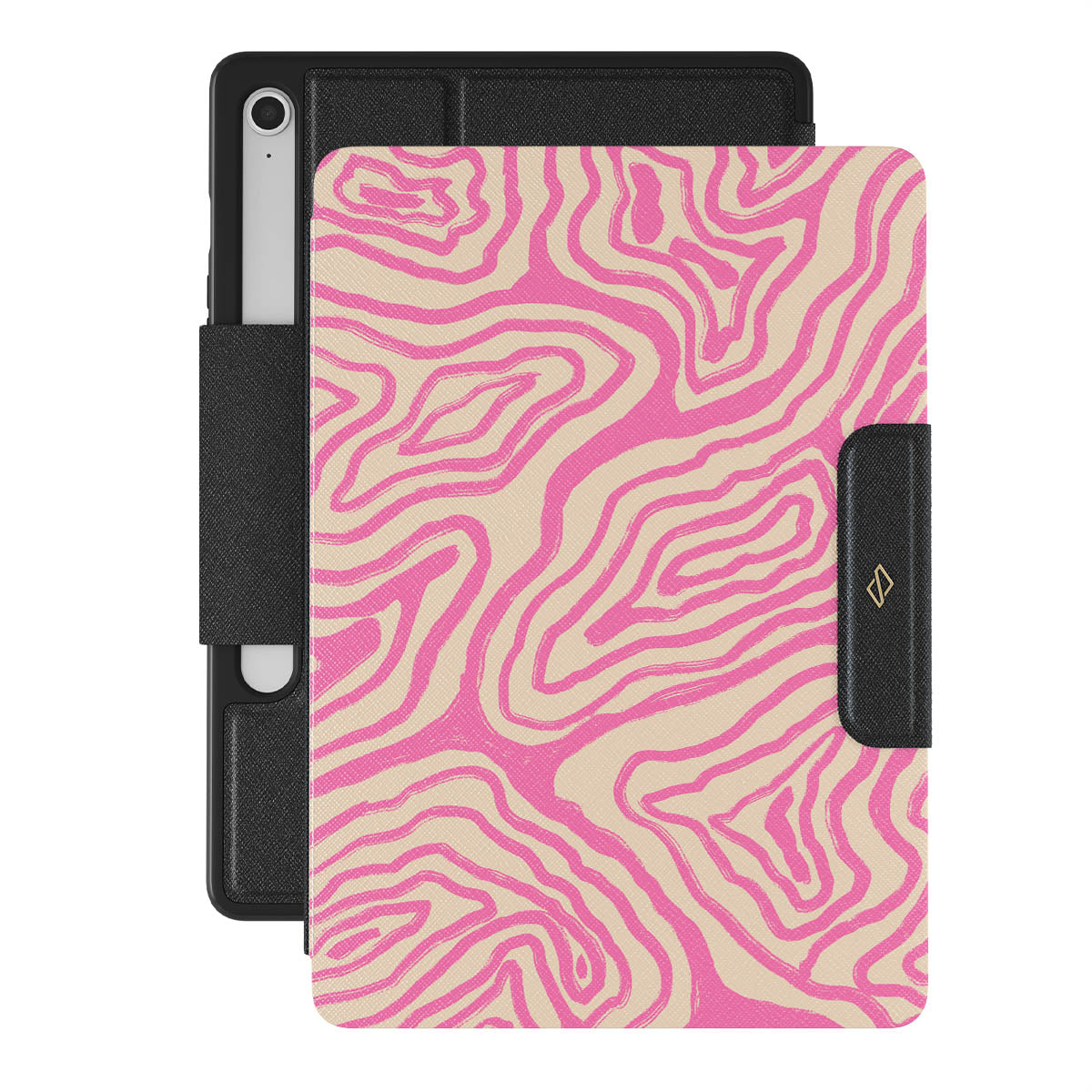 The Pink Shores Samsung Galaxy Tab S10 FE folio case features mesmerizing pink swirls on a cream background. This vibrant, beach-insipired pattern captures the serene beauty of sandy beaches kissed by soft pink waves. Perfect for those who love unique, ocean-inspired aesthetics.