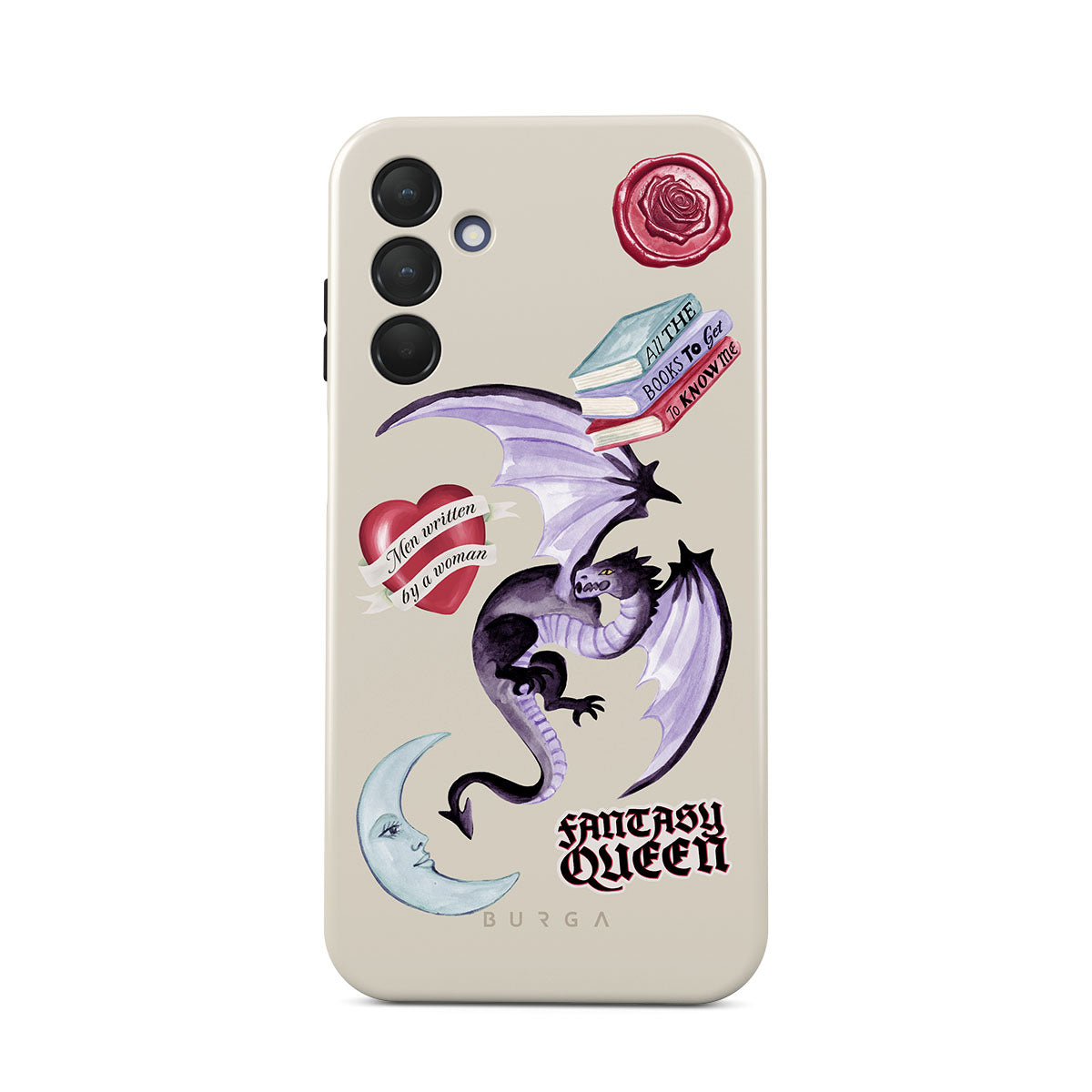 This design features: purple dragon, "Fantasy Queen" sticker, crescent moon, purple wax seal, heart with message, books