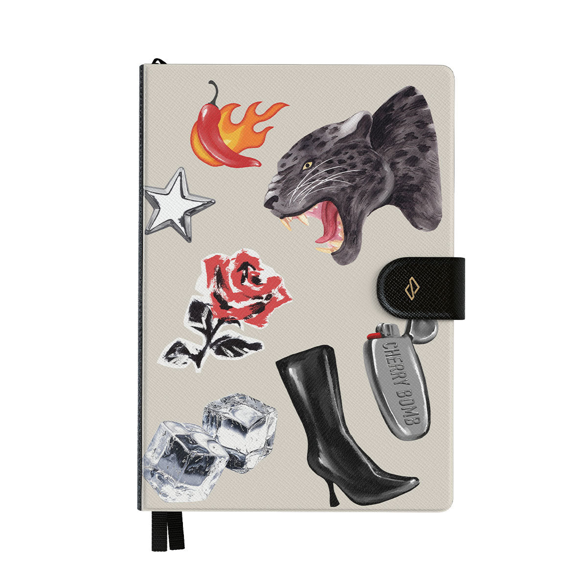 This design features: black panther, red rose, burning bell pepper, silver lighter, black knee-high boots, ice cubes, silver star