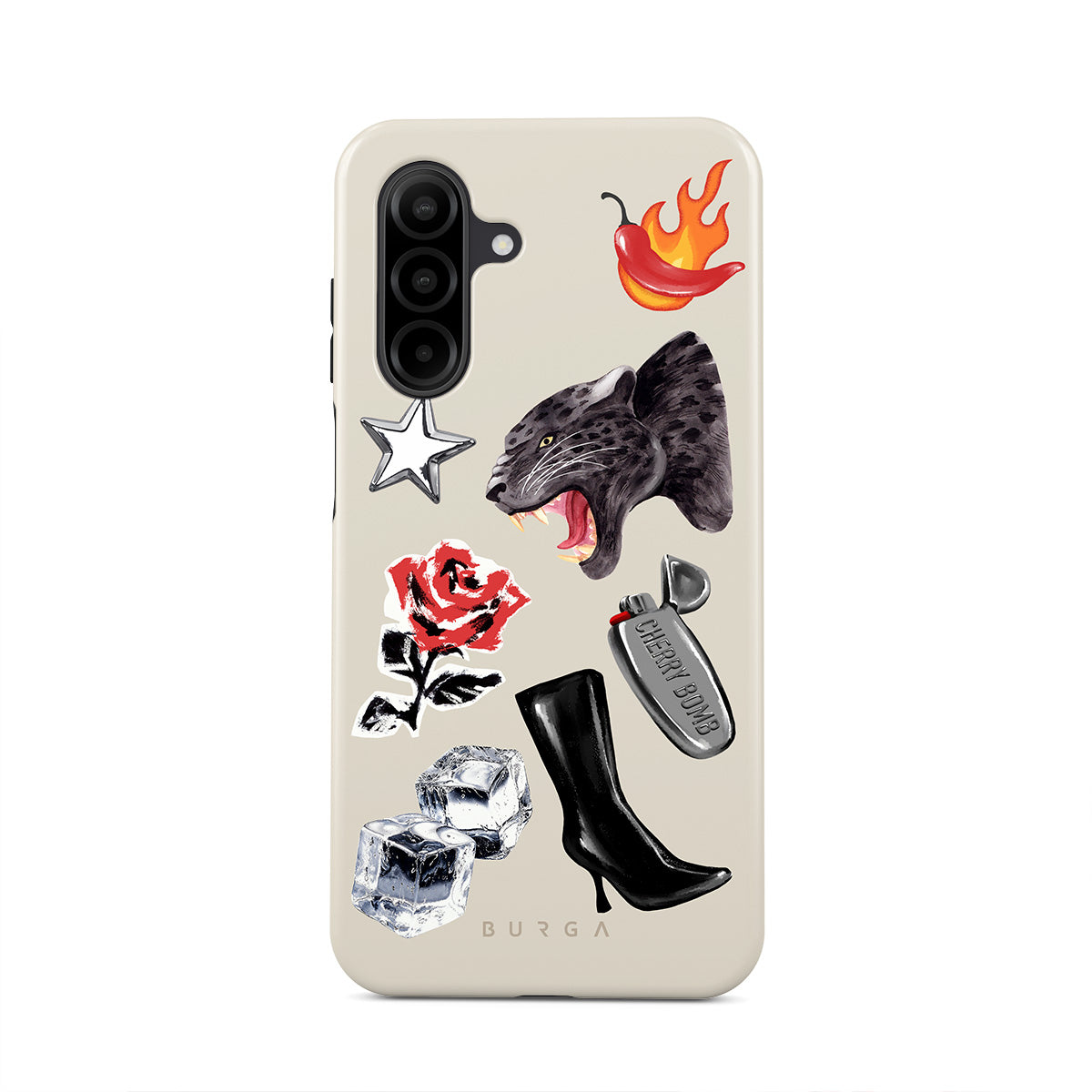 This design features: black panther, red rose, burning bell pepper, silver lighter, black knee-high boots, ice cubes, silver star