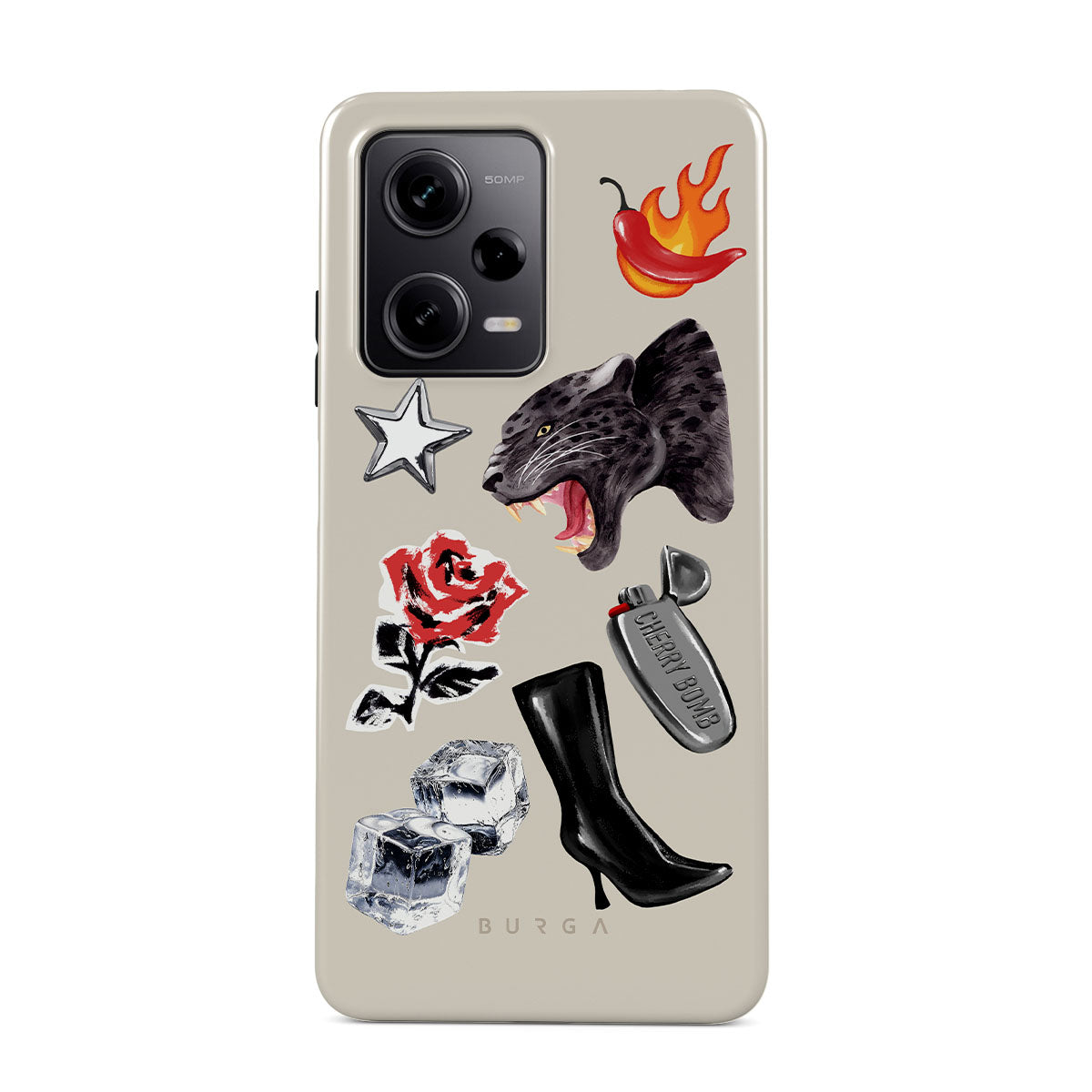 This design features: black panther, red rose, burning bell pepper, silver lighter, black knee-high boots, ice cubes, silver star