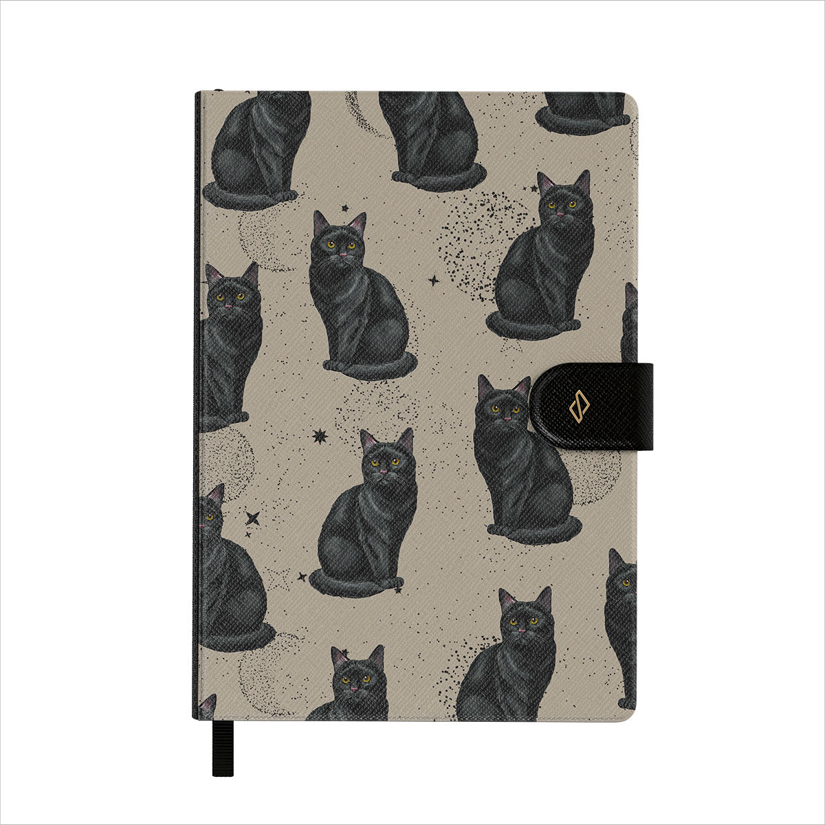 This design features: black cats, mystical symbols.