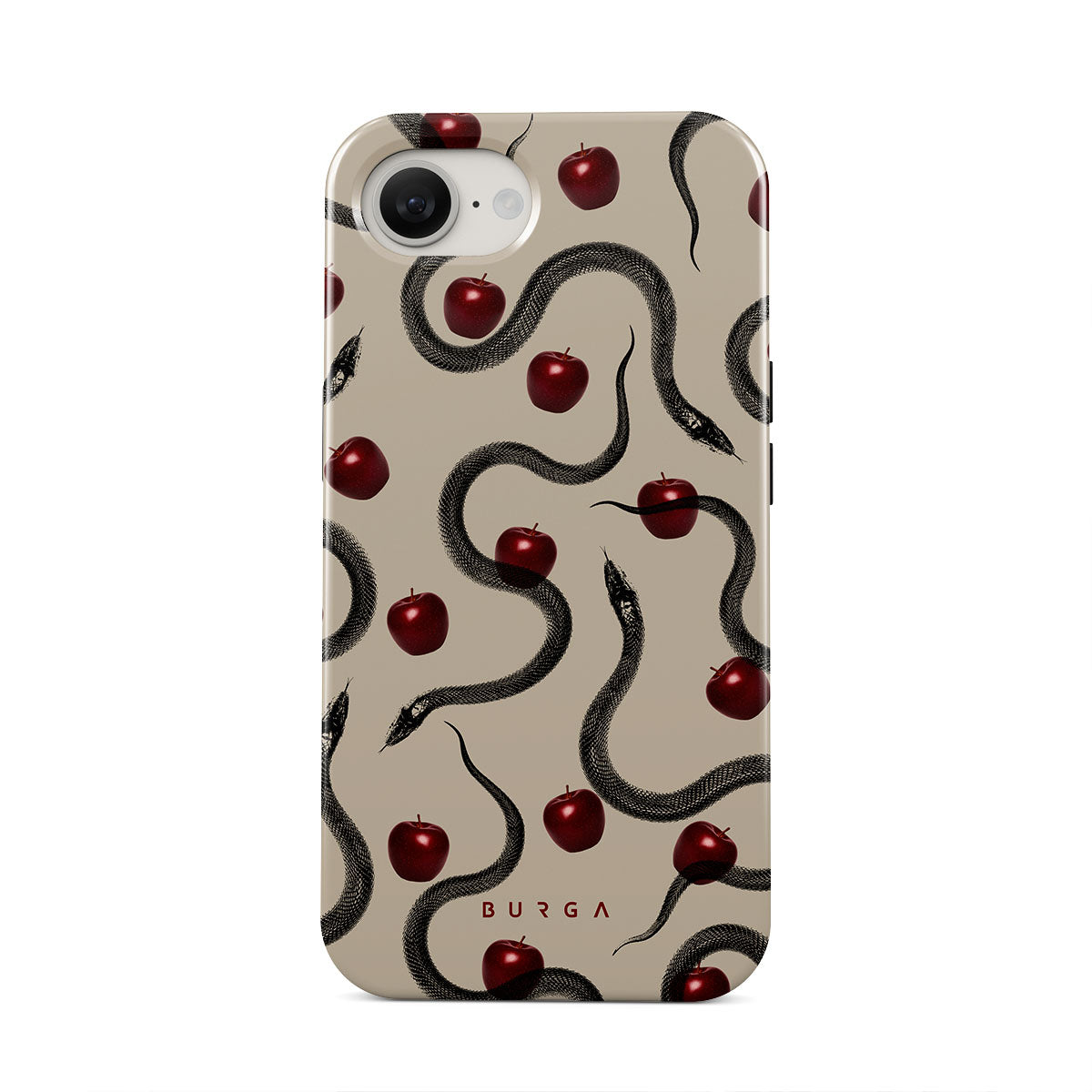 This design features: glossy red apples, coiled serpents, beige tones