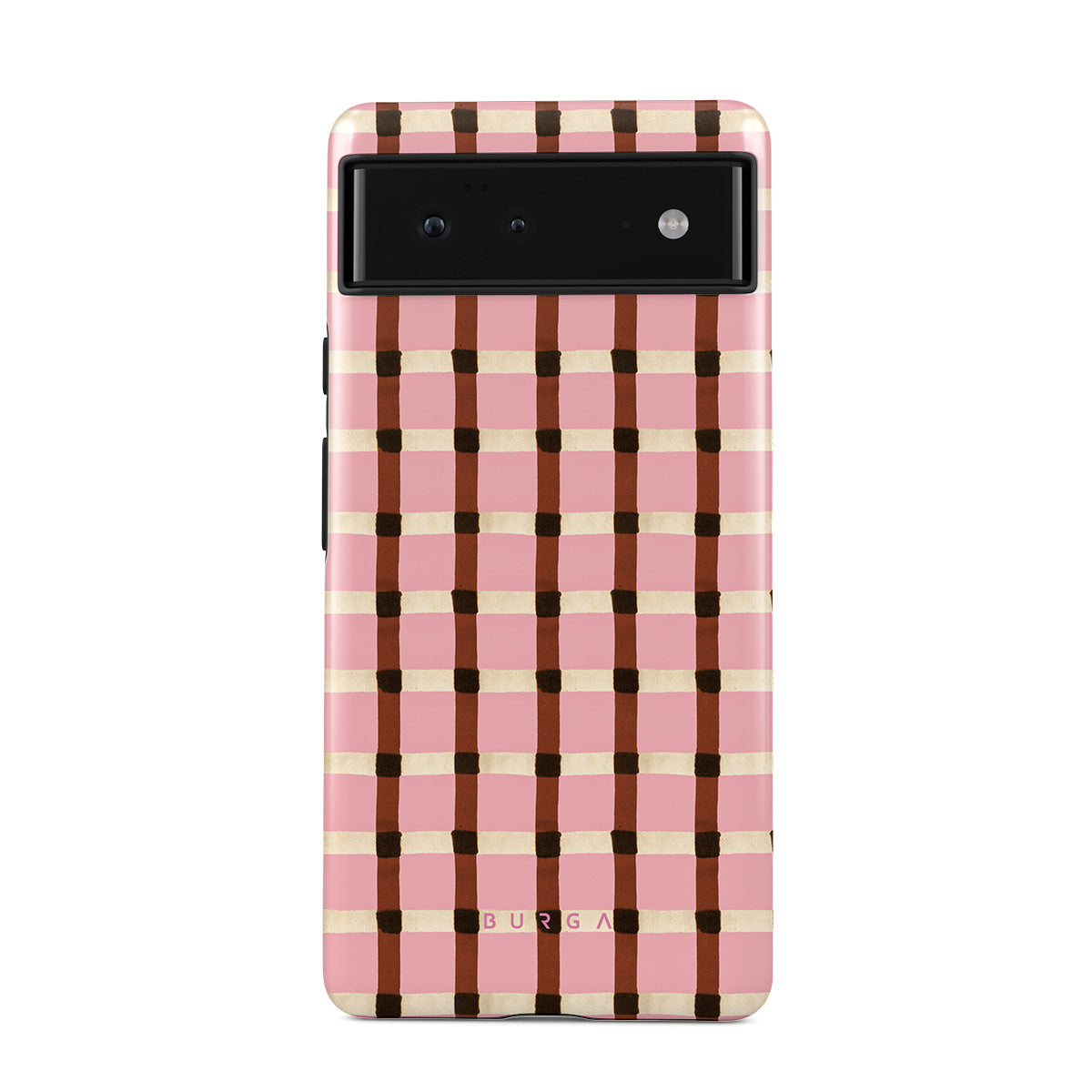 This design features: pink and brown checkered pattern, gingham pattern