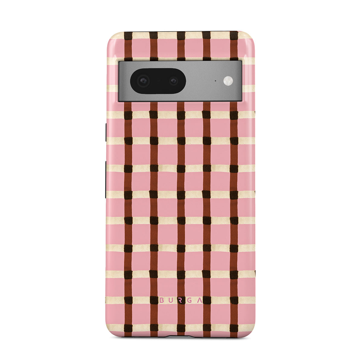 This design features: pink and brown checkered pattern, gingham pattern