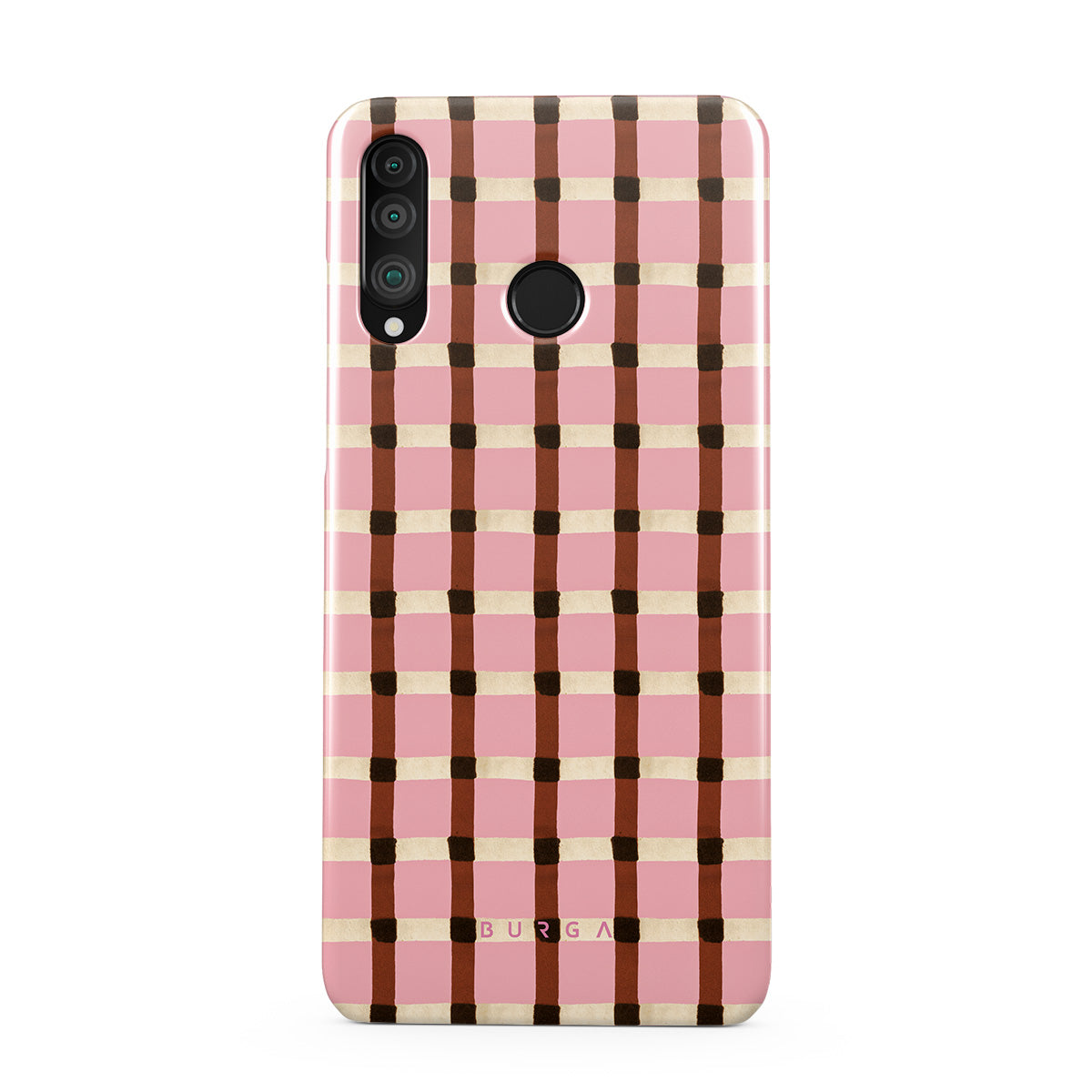 This design features: pink and brown checkered pattern, gingham pattern