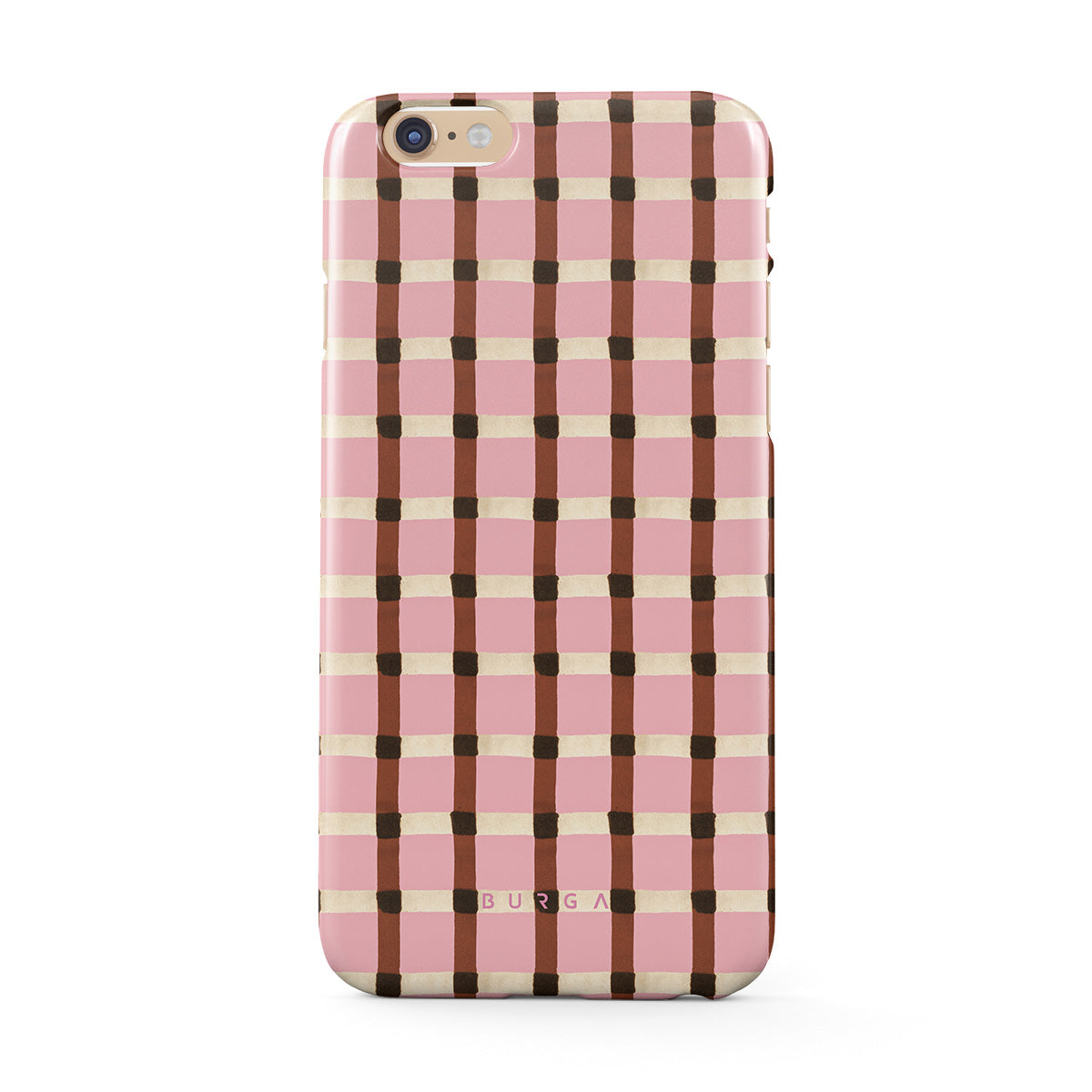 This design features: pink and brown checkered pattern, gingham pattern
