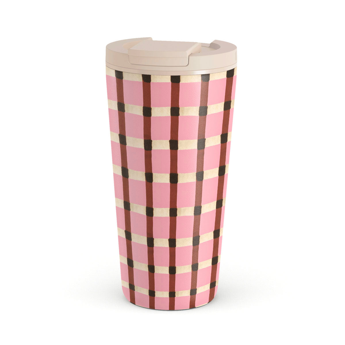 This design features: pink and brown checkered pattern, gingham pattern