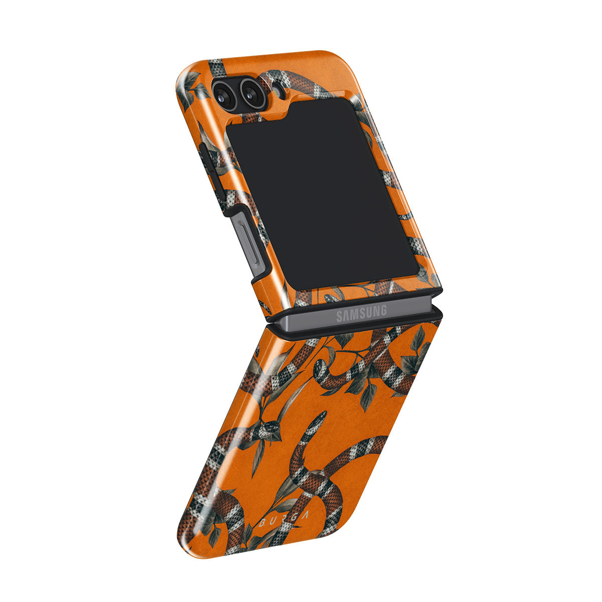 Take a bit of fierceness with yourself with our bright orange and dangerously beautiful Samsung Galaxy Z Flip 5 phone case with a snake pattern. This case is real eye candy for fashion lovers and just as needed for those who strive to keep their phones protected.