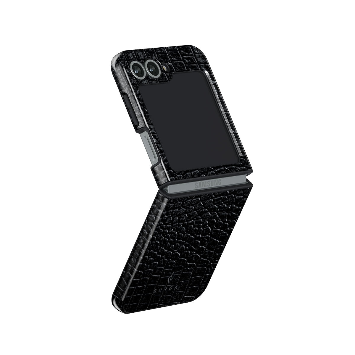 Our Reaper's Touch Samsung Galaxy Z Flip 6 phone case cover features a classic snakeskin design in dark black. The dangerous animal print will add confidence and a touch of luxury to your style while transforming your phone into a fashion accessory.