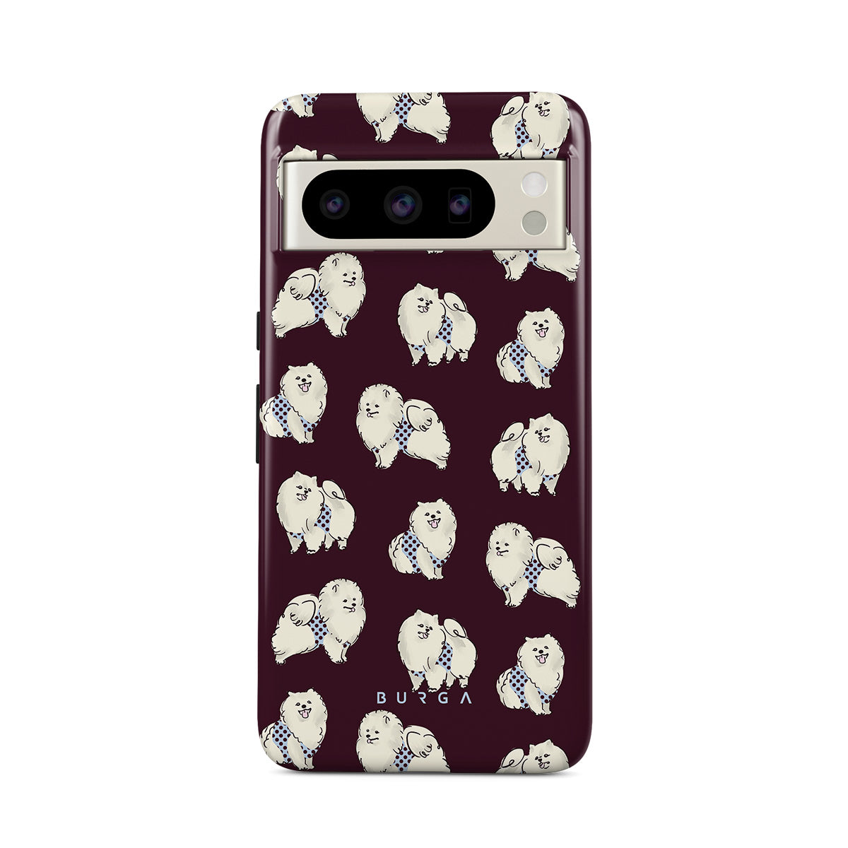 This design features: white fluffy dogs on a deep burgundy background, poodles, pets.