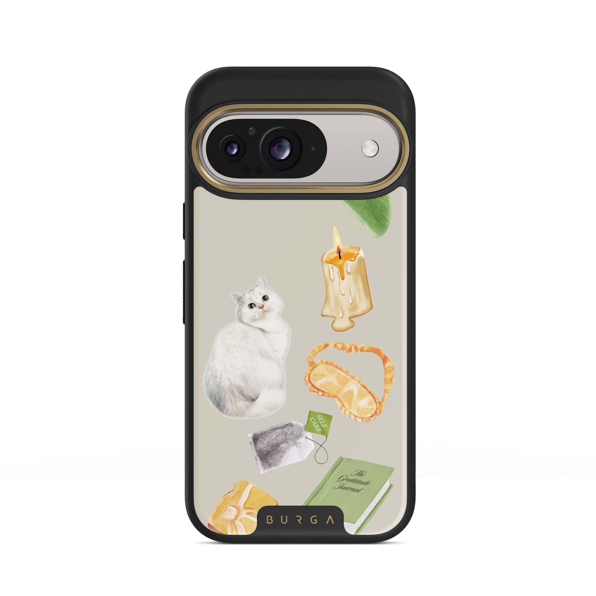 This design features: white cat, green book, candle, Gua Sha bar, sleeping mask, tea bag, yellow crystal