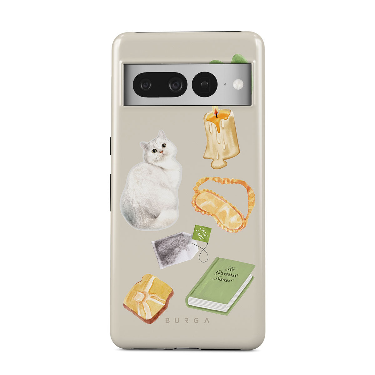 This design features: white cat, green book, candle, Gua Sha bar, sleeping mask, tea bag, yellow crystal