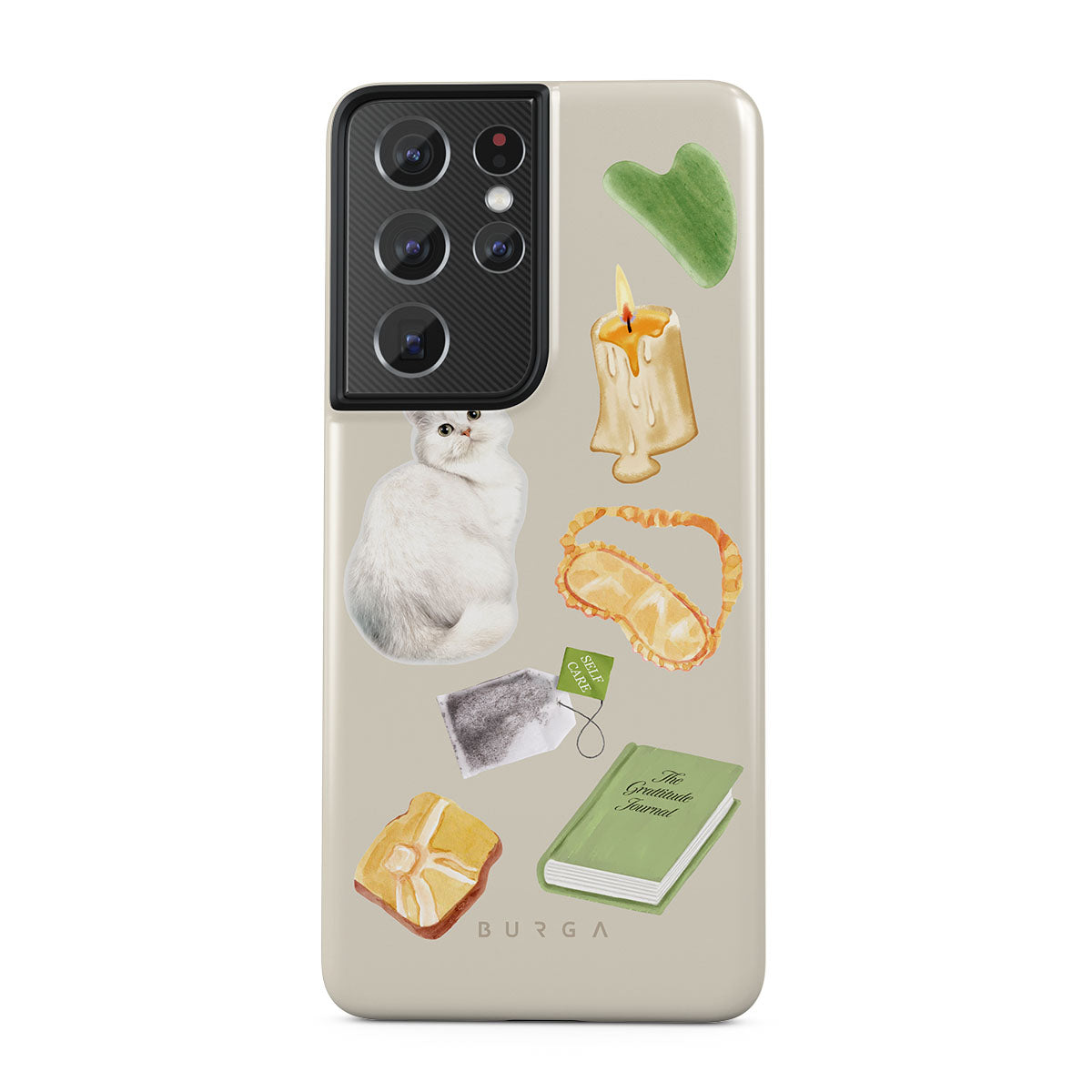 This design features: white cat, green book, candle, Gua Sha bar, sleeping mask, tea bag, yellow crystal