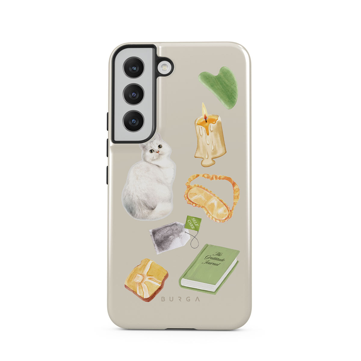 This design features: white cat, green book, candle, Gua Sha bar, sleeping mask, tea bag, yellow crystal